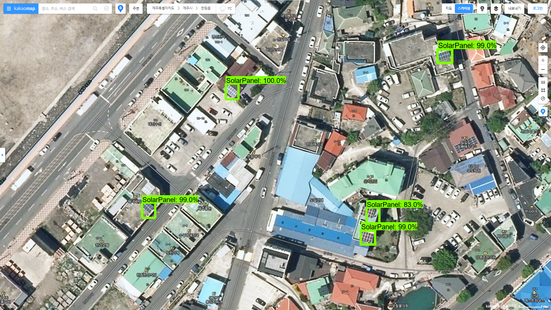 이 모델의 Threshold 값을 낮추어 항공 위성사진의 태양광 패널을 검출하고, 그럭저럭 잘 검출된 사진만 추려서 새로운 데이터로 삼아 재학습하는 방식을 구상하고있습니다.