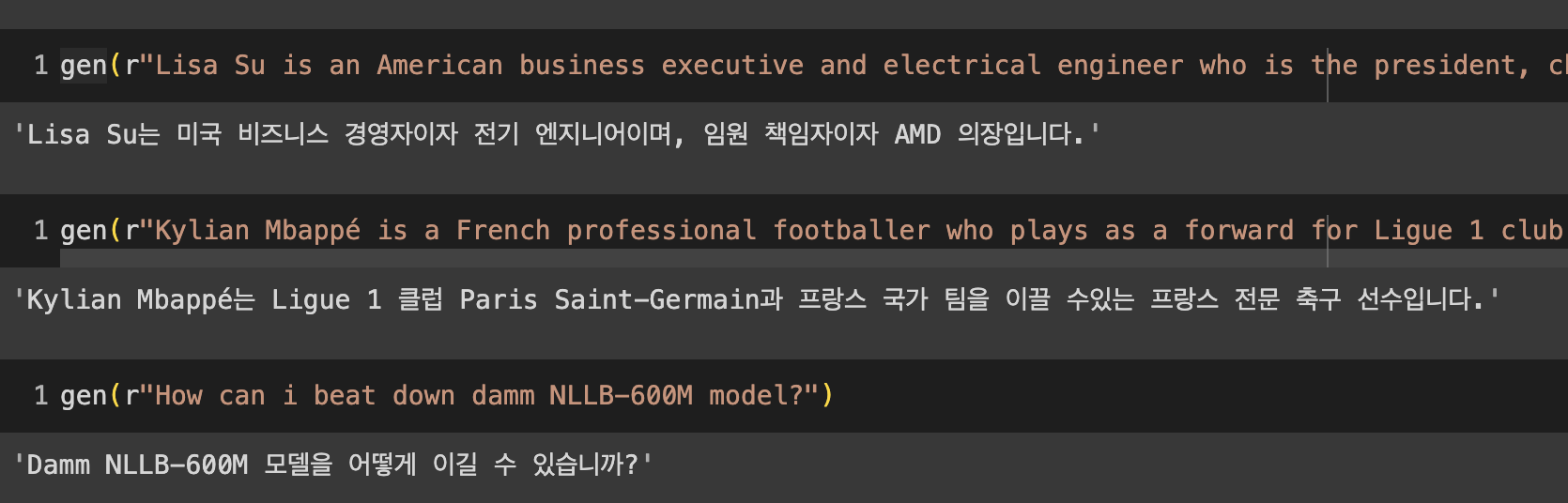 If Nothing last forever, would you be my 'Nothing'? 이런건 잘 못함 ㅠ 그래도 악조건 속에서도 그럭저럭 모델을 만들어 냈다. 무엇보다도 사이즈가 1.4GB라서 나의 반려 GPU 1650s 4GB로도 서빙이 가능하다! 초기 목적은 어느정도 달성한 셈이다. 24.6점이긴 하지만 formal한 영문장 정도는 문제 없이 번역한다. 사용할만한 가치가 있을 것 같다. 역시 뭐든 첫시도에 완벽하게 되는건 없는것 같다. 이렇게 점점 경험치를 먹어가며 성장해 가야지!