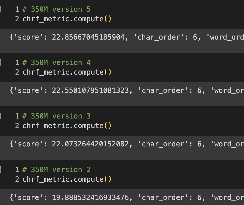 두근두근 얼마나 할까 약속받은 지원금을 다 털어서 colab pay as you go 를 결제했고 A100 GPU로 학습을 했다. 데이터의 크기가 약 2천만건 쯤 되어서, 100만건 단위로 쪼개어 학습하고 저장하고를 반복했다. colab은 중간에 맘대로 런타임이 꺼져서 꼭 중간 저장을 해주어야 한다. huggingface에 Private으로 사이사이에 push를 해주었다. 중간에 다른 데이터로 학습도 해보았지만, chrF 점수가 오르지 않았다. 아마 데이터 퀄리티가 떨어지는 탓일 것이다. 최종적으로 1500만건의 데이터를 학습했고 결과는 아래와 같다.