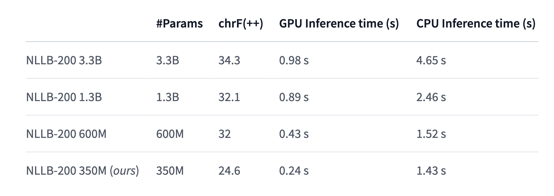NLLB-200 Distilled-350M_en2ko The NLLB-200 model showed outstanding performance in translation task and contributed to solving problems with low-resource languages. Despite their efforts, it is still hard to run 600M or more than 1B model for those who hav