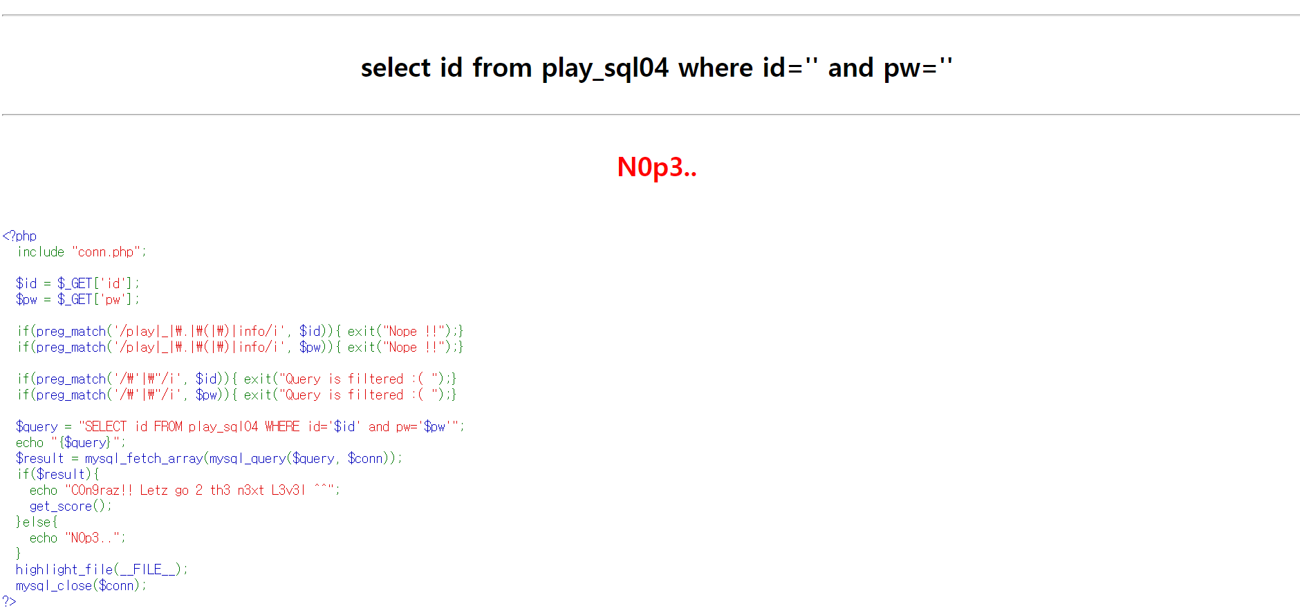 if(preg_match('/\'|\"/i', $pw)){ exit("Query is filtered :( ");}이 두 부분만 추가된 형태다.