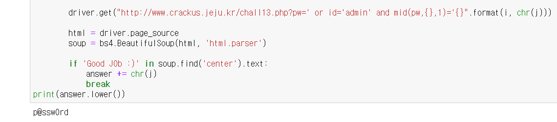 그래서 result에 값이 들어있나 $result['pw']==$_GET['pw'] 는 만족하지 못하므로, else if (%result) {echo "Good J0b :D;}으로 넘어가버린다.